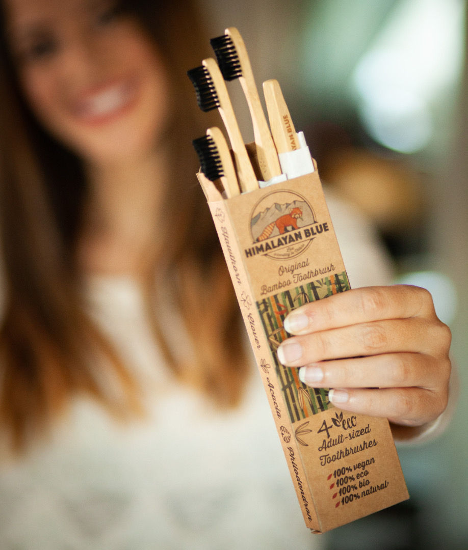 This photograph features a woman holding the Himalayan Blue pack of 4 adult toothbrushes, with the focus primarily on the beautifully designed packaging. The blurred background creates a sense of depth, drawing attention to the product while subtly showcasing the woman’s engagement with the brand.