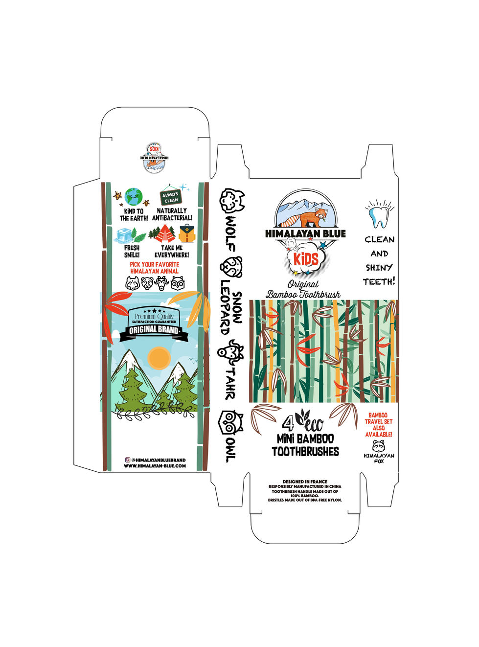 The Himalayan Blue packaging for kids is a burst of playful and friendly energy, designed to delight young users and make oral care an exciting part of their day. This range features vibrant colors and charming illustrations of animals, creating an approachable and engaging experience. The packaging is crafted to be visually stimulating and inviting, reinforcing the brand's "Live According to Nature" ethos in a way that resonates with children, making sustainability fun and accessible.